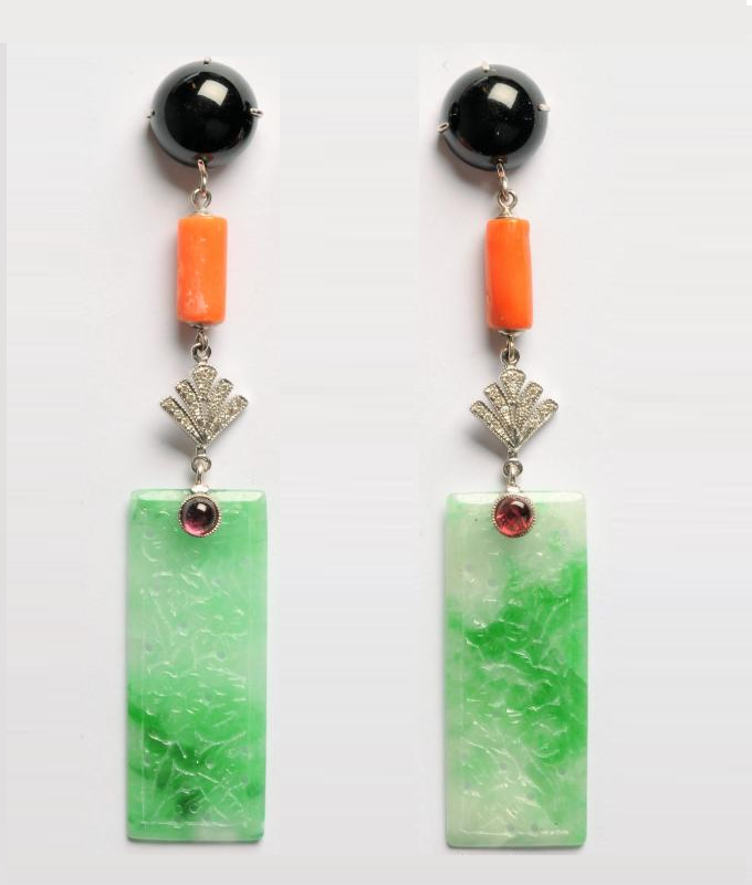 Pair of White Gold, Jade & Diamonds Art Deco Earrings